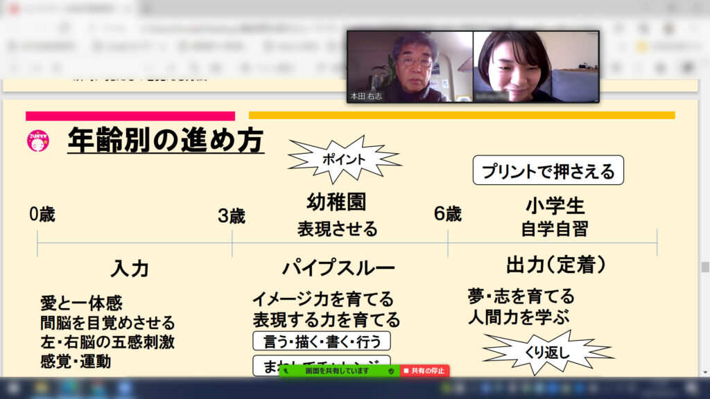 現在、長男6歳、次男3歳、三男1歳の三人のお子さんがいます。同じく幼児右脳教育にご興味を持って受講中です。現在、ご長男をさっくん先生と呼んで、彼と一緒にご家庭での取り組みを実践しているとのことです、特に右脳記憶トレーニング取り組みを歌を歌いながら弟さんたちと一緒に取り組んいるとのことです。